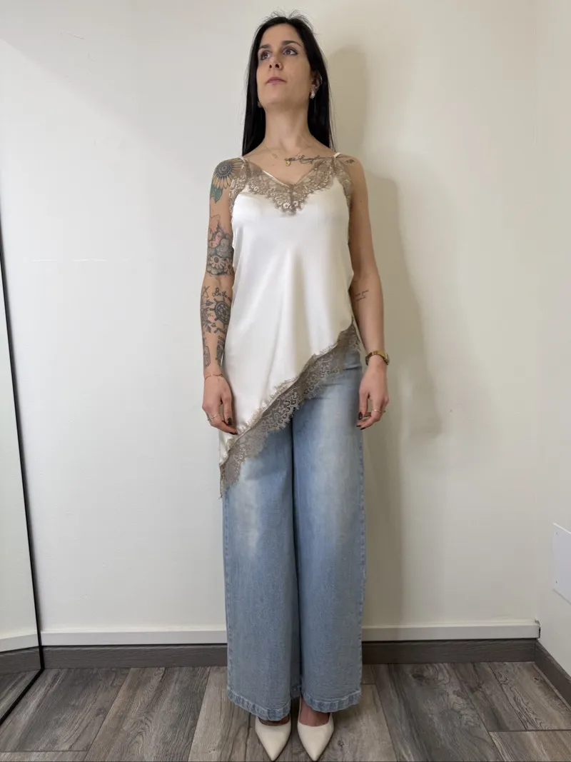 Top satin avorio con taglio diagonale e pizzo biscotto, spallina regolabile