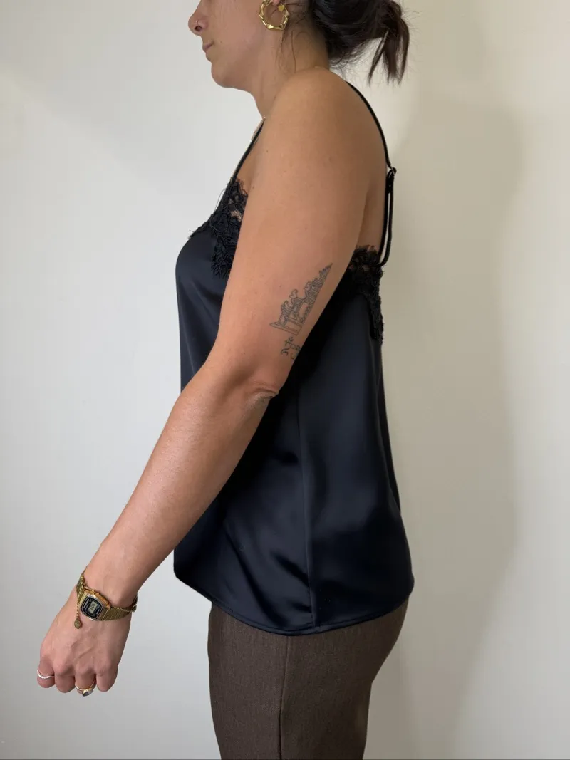 top satin con spallina regolabile e pizzo imperial la modella è alta 1,70cm e indossa la taglia M