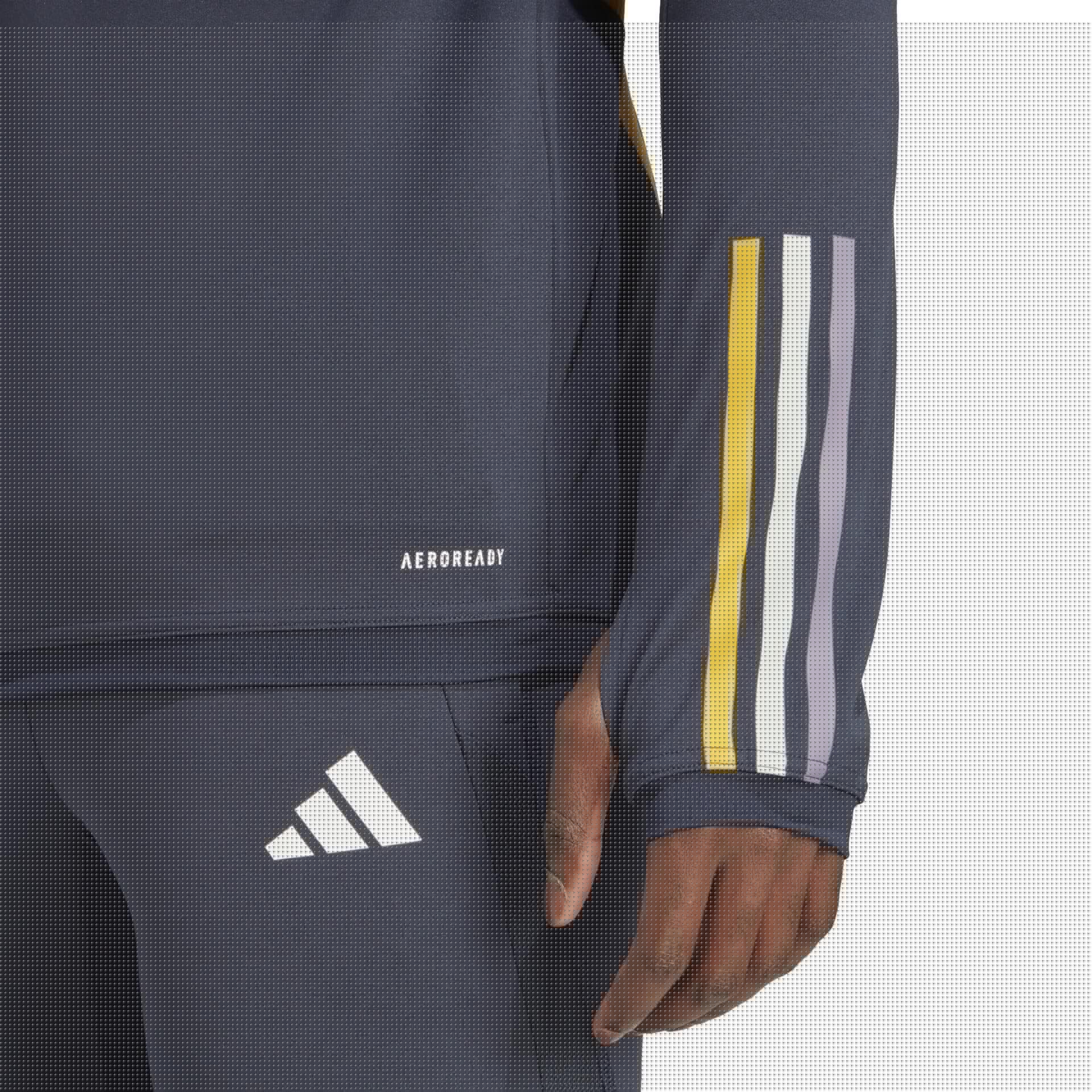 Track top allenamento 23/24 Real Madrid Questa maglia da allenamento del Real Madrid è dotata di tecnologia AEROREADY per mantenere la pelle asciutta, mentre le asole per i pollici sui polsini e la struttura elasticizzata a coste sulle braccia assicurano una vestibilità aderente e una protezione dal freddo ottimale. La struttura in morbida spugna offre il massimo comfort mentre sostieni gli eroi del Bernabéu. Questo prodotto contiene il 100% di materiali riciclati ed è solo una delle nostre soluzioni per la lotta contro l’inquinamento causato dai rifiuti plastici.” SPECIFICHE Track top allenamento 23/24 Real Madrid Taglio aderente Zip da ¼…