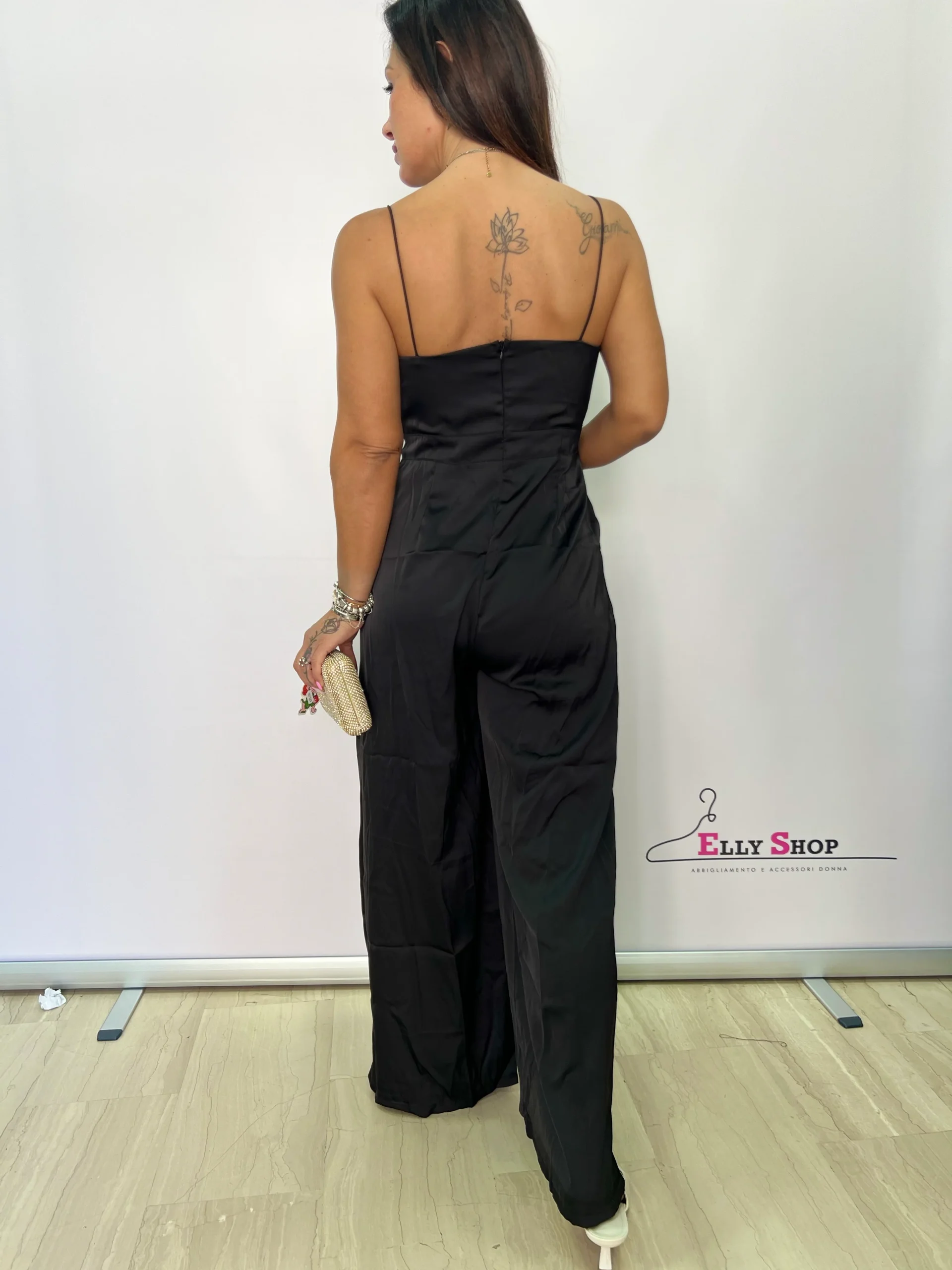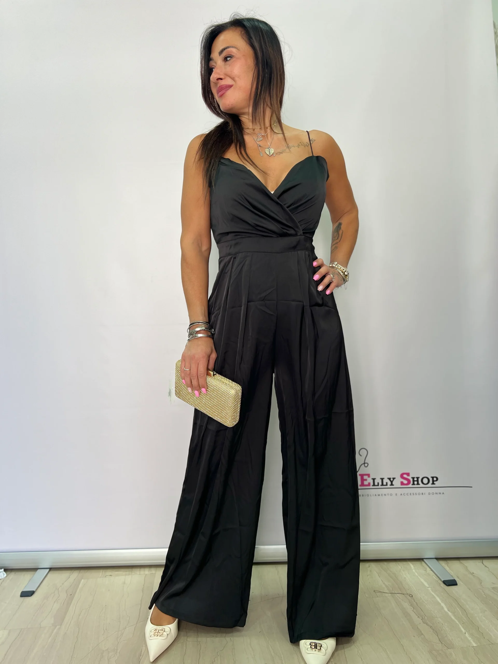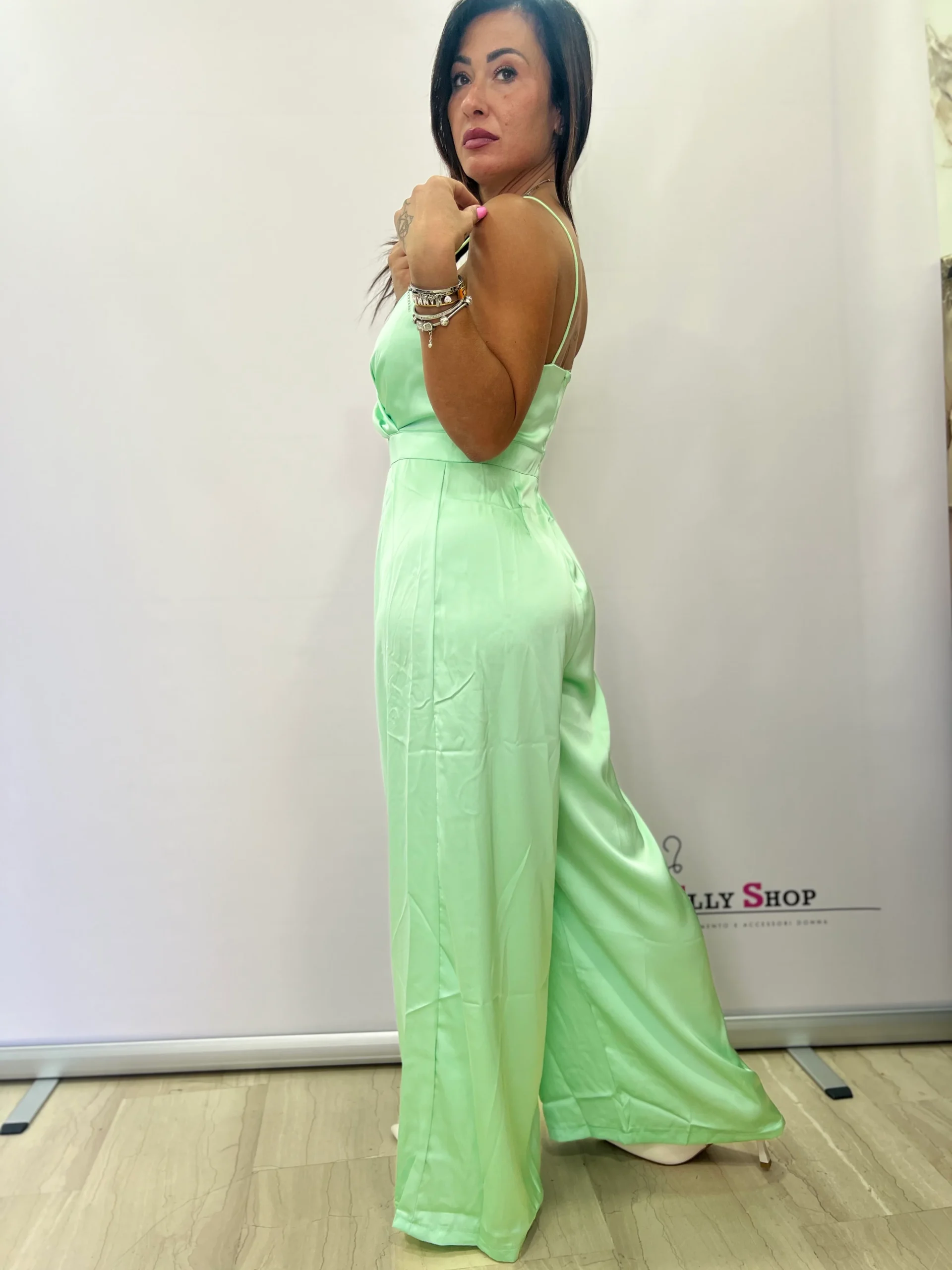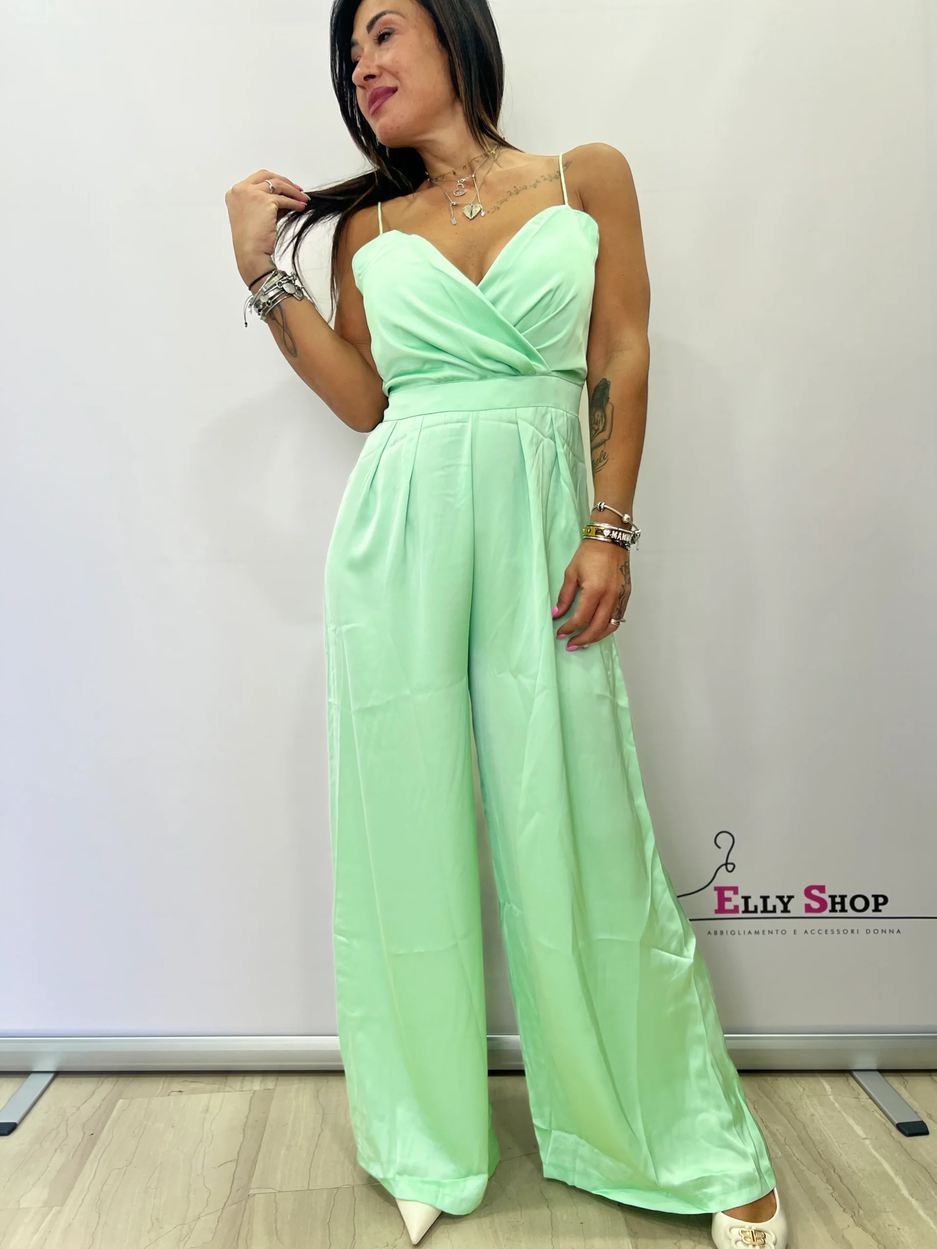 Questa tuta lunga in raso lucido è l’emblema della femminilità e dell’eleganza, perfetta per cerimonie, feste serali o eventi speciali. Il corpino con scollo a portafoglio valorizza il décolleté, mentre le spalline sottili donano un tocco raffinato. La parte inferiore presenta pantaloni ampi e scivolati che allungano la figura, creando un look slanciato e armonioso. Disponibile in tre tonalità brillanti — verde pastello, fuxia acceso e nero classico — è una scelta versatile e di tendenza per la stagione estiva.