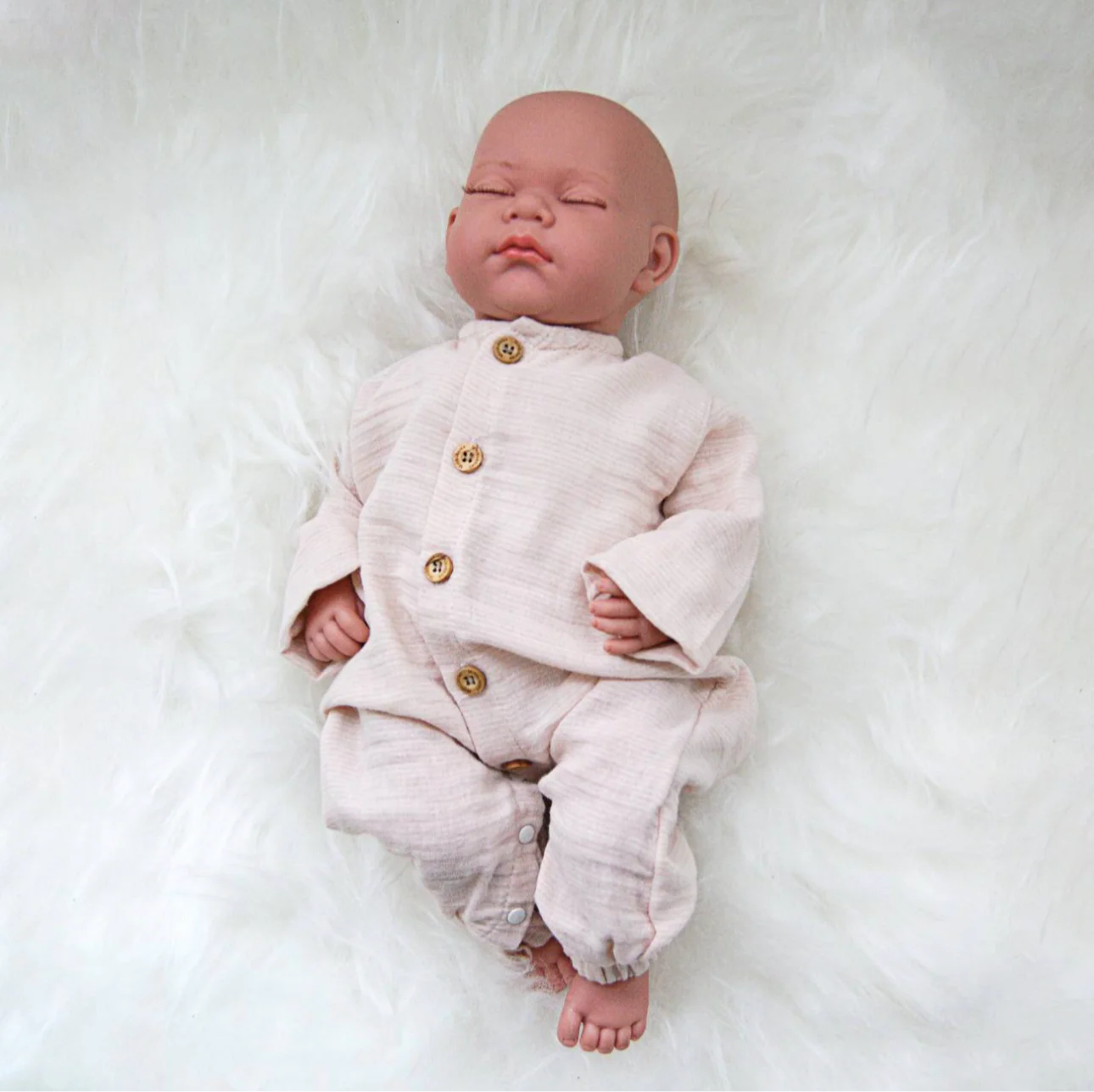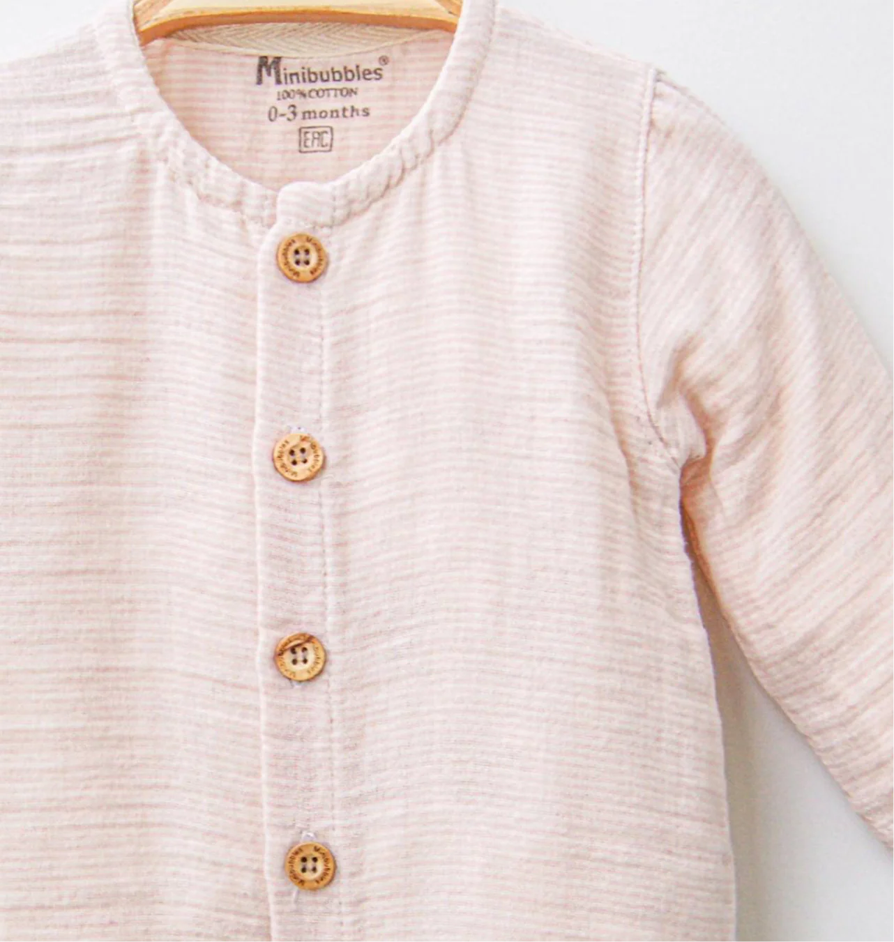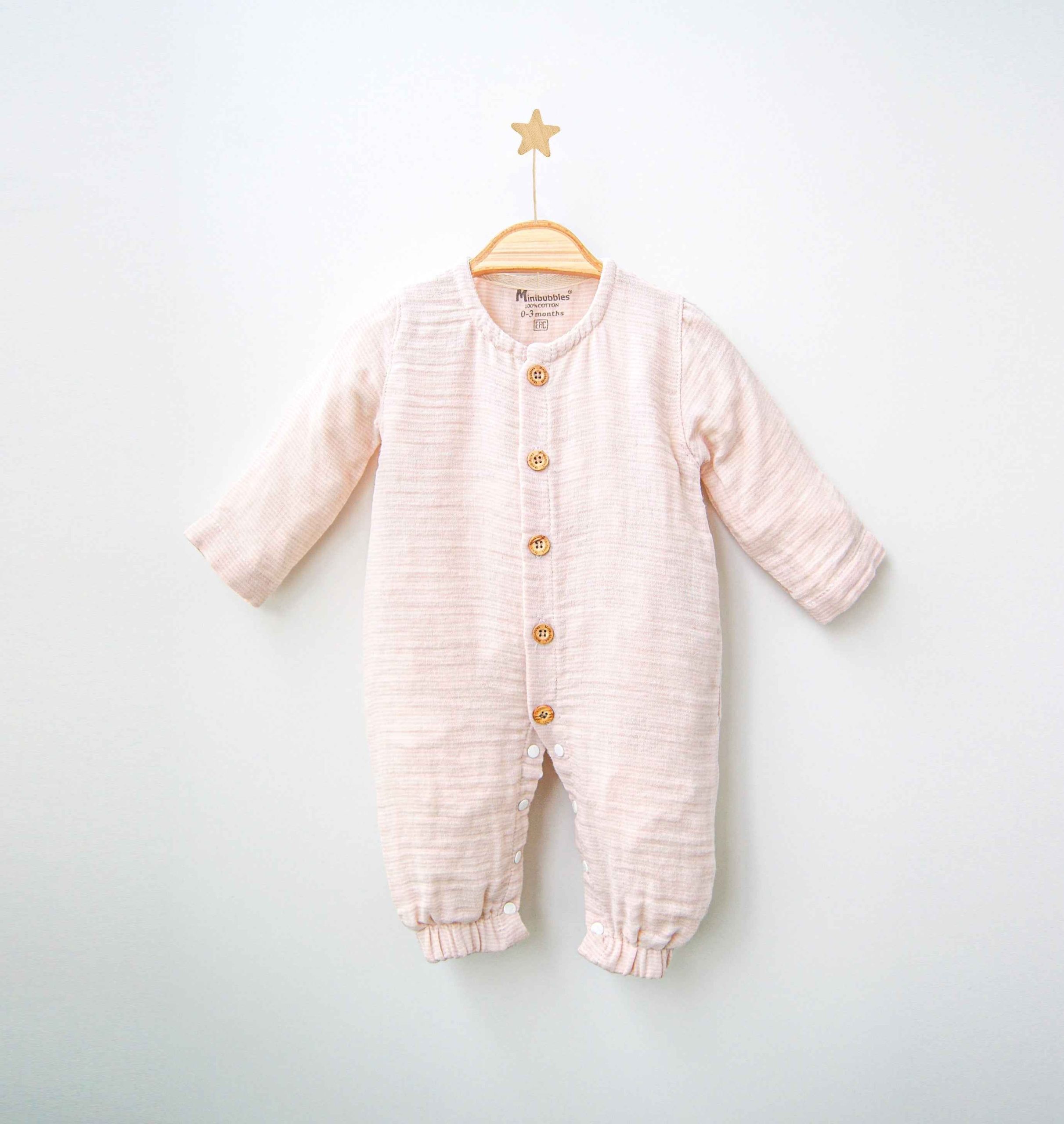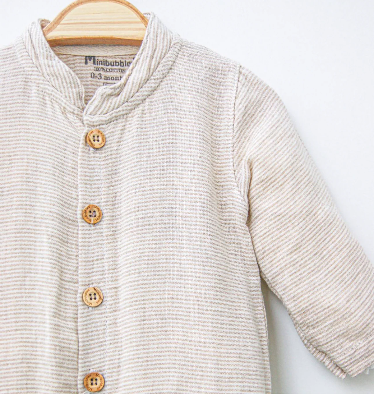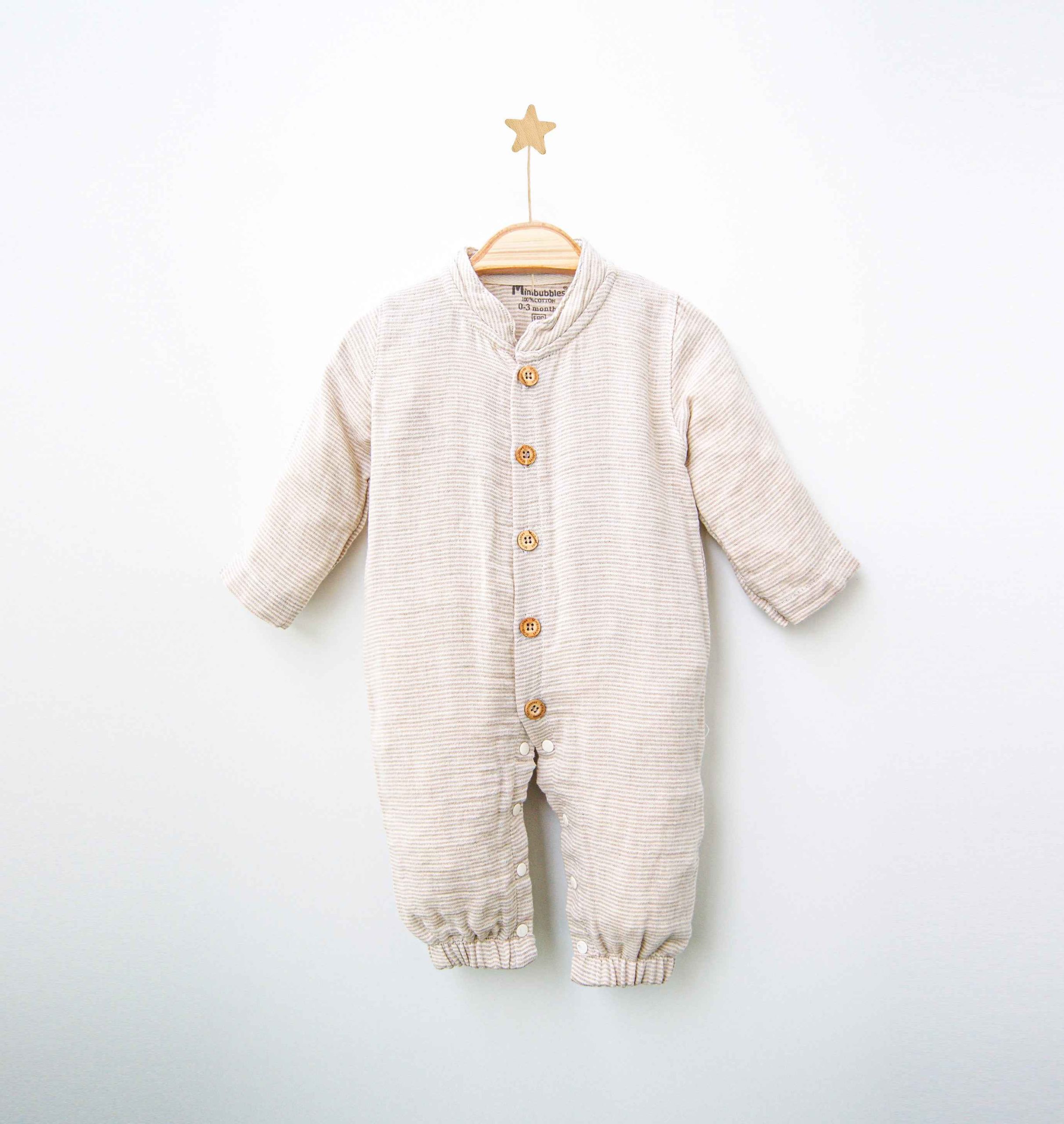Questa deliziosa tutina a maniche lunghe รจ realizzata in cotone organico 100%, perfetta per la pelle delicata dei neonati. Il design essenziale ed elegante รจ impreziosito da bottoni in legno naturale, che facilitano la chiusura e il cambio del pannolino grazie ai pratici bottoncini a pressione sul cavallo.
