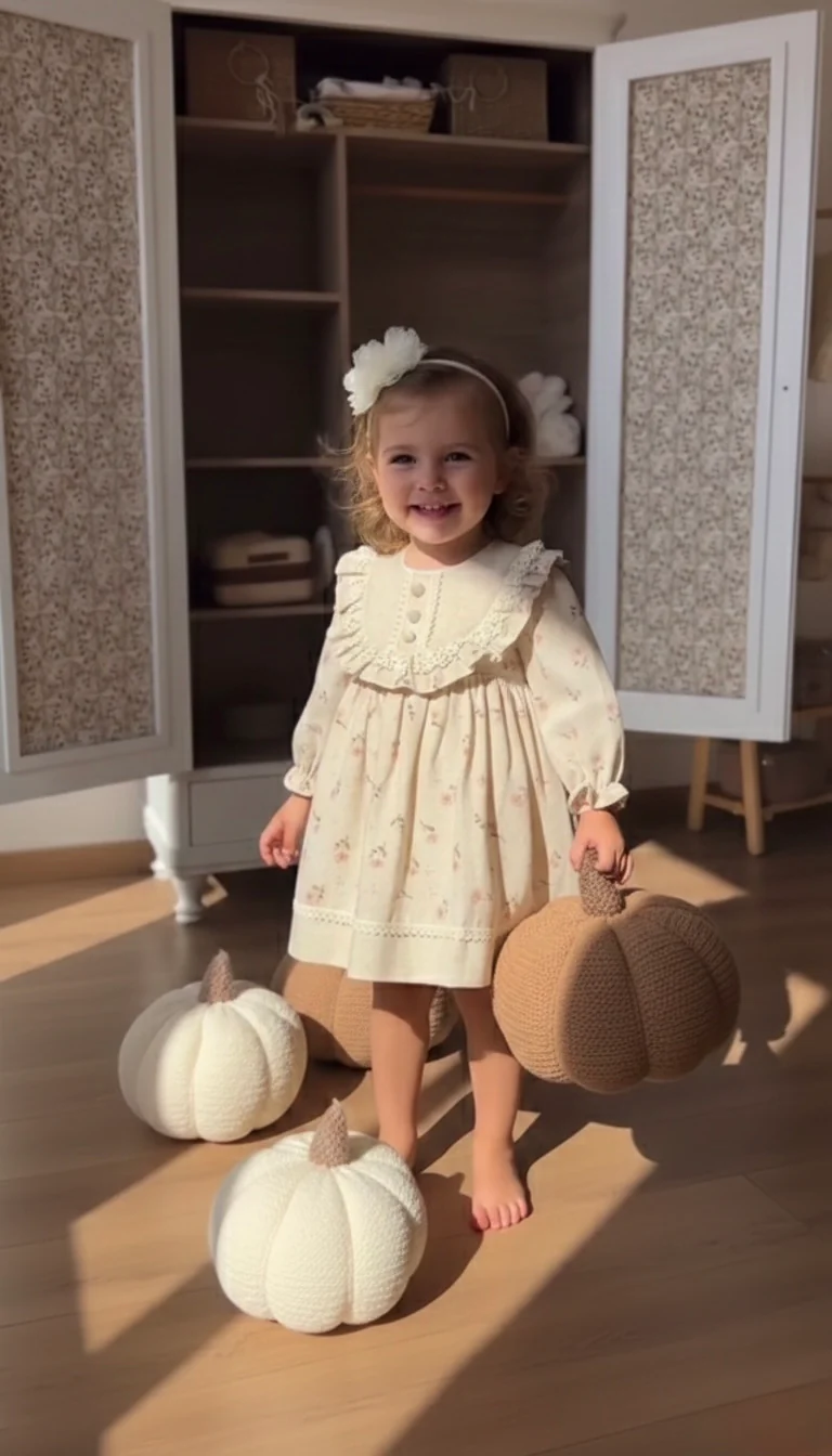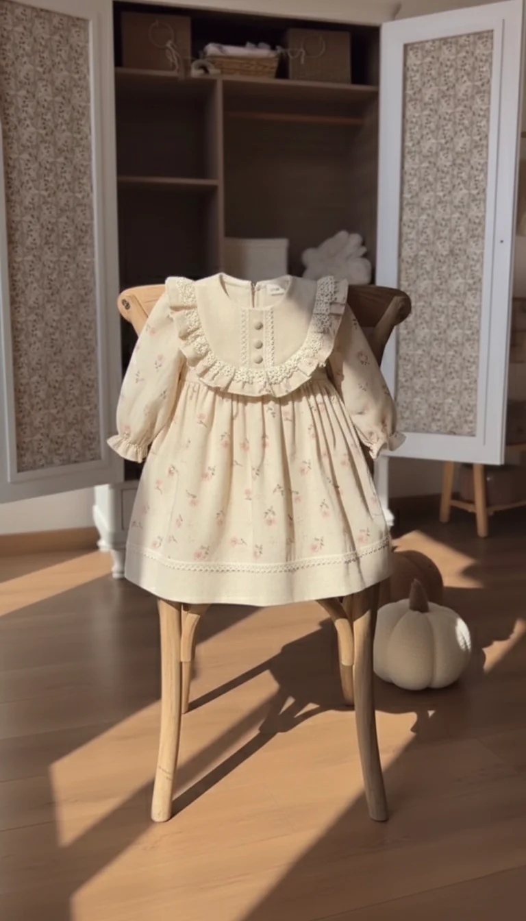 Elegante e delicato abito da bambina realizzato in morbido tessuto color crema con micro fantasia floreale nei toni del rosa cipria. Il modello presenta maniche lunghe con arricciature al polso, corpino arricchito da una balza con inserti in pizzo e bottoncini decorativi sul davanti. La gonna ampia e leggermente arricciata garantisce comfort e libertร di movimento.